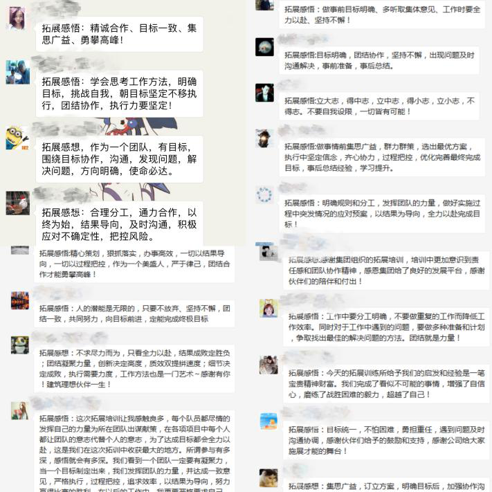 各項(xiàng)挑戰(zhàn)過(guò)后,大家都積極進(jìn)行分享總結(jié),討論個(gè)人與小組的成敗原因,通過(guò)游戲反思工作與生活;付出有多少,收獲便會(huì)有多少,在日后的工作中,以結(jié)果為導(dǎo)向,為了目標(biāo)找方法,不找借口,發(fā)揮團(tuán)隊(duì)的力量,凝心聚力,決戰(zhàn)未來(lái)!