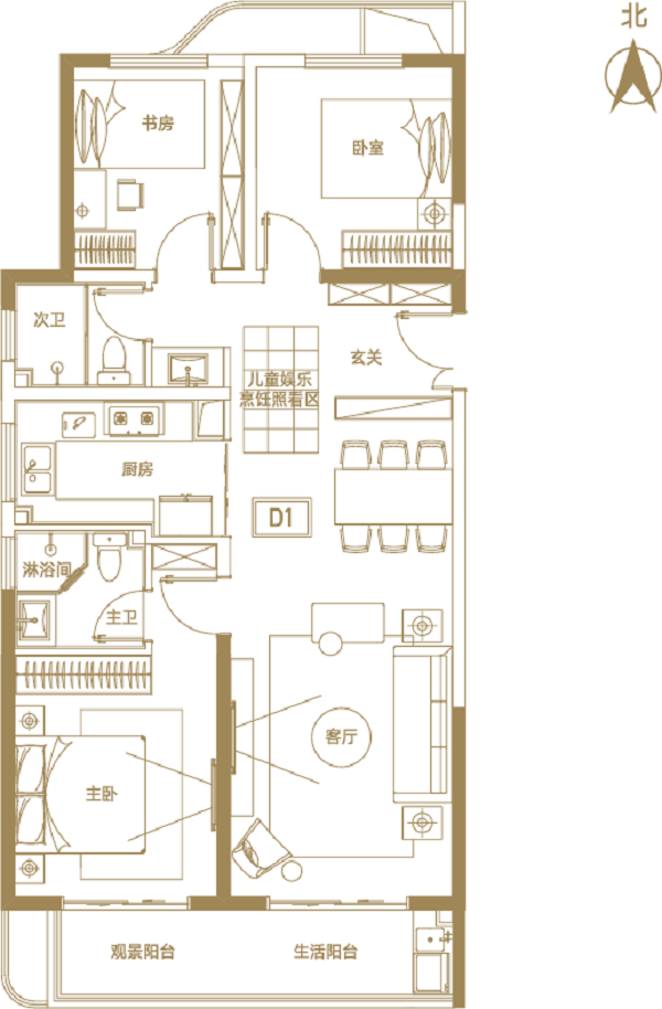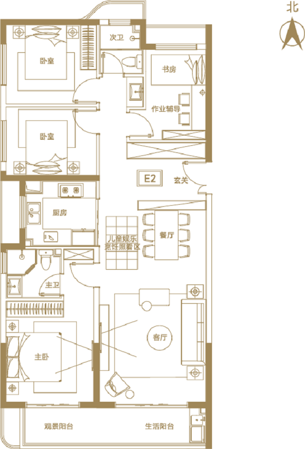 主臥與客廳均朝南,滿足全家人的采光需要;同時專門設置了兒童娛樂烹飪照看區,時刻關切孩子成長的每一瞬間。