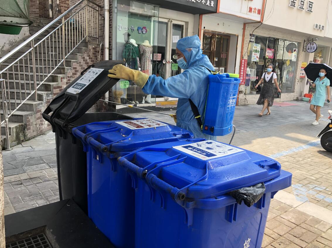 現場一遍遍消殺、消毒,維持秩序的物業工作人員